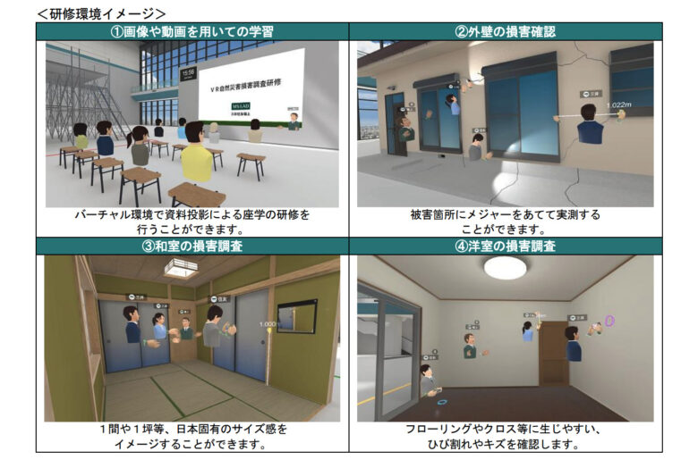 こちらは、VRで再現された家屋に集まり、家屋の損害状態を調査・確認する方法を擬似体験するという事例です。損壊がある部分に仮想的なメジャーを当てて実測したり、六畳一間の一般的な大きさの部屋に入ることで部屋の大きさの感覚を掴んだりといった体験ができます。